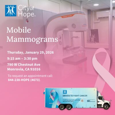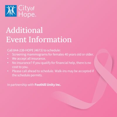 We are proud to partner with the City of Hope once again to offer mammogram screenings for women 40 years of age or older: